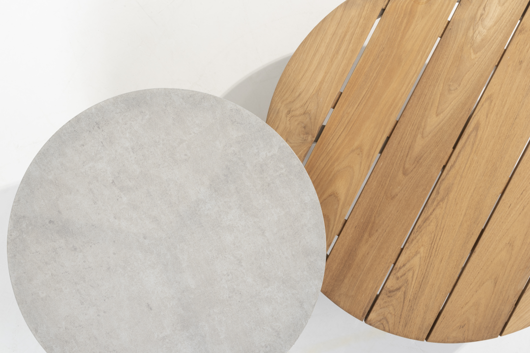 De set bestaat uit twee elegante tafels met een diameter van ร 65 cm en ร 80 cm, ideaal voor het serveren van drankjes of het uitstallen van decoratieve items. De lichte Latte-kleur van de tafels harmonieert prachtig met de kussens, waardoor een uitnodigende sfeer ontstaat. Of je nu een intieme bijeenkomst organiseert of gewoon wilt ontspannen in de zon, de Loungetafel set Emma biedt de perfecte setting.