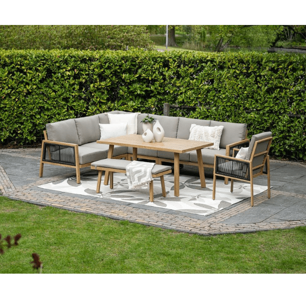 De set bestaat uit een ruime bank, een comfortabele hoekbank, een stijlvolle stoel en een praktische tafel, allemaal ontworpen om uw buitenruimte te transformeren in een oase van rust. De kleur van de set straalt verfijning uit, terwijl de bijpassende kussens zorgen voor een uitnodigende sfeer. Gemaakt van duurzaam materiaal, is deze set bestand tegen verschillende weersomstandigheden en biedt het jarenlang plezier.