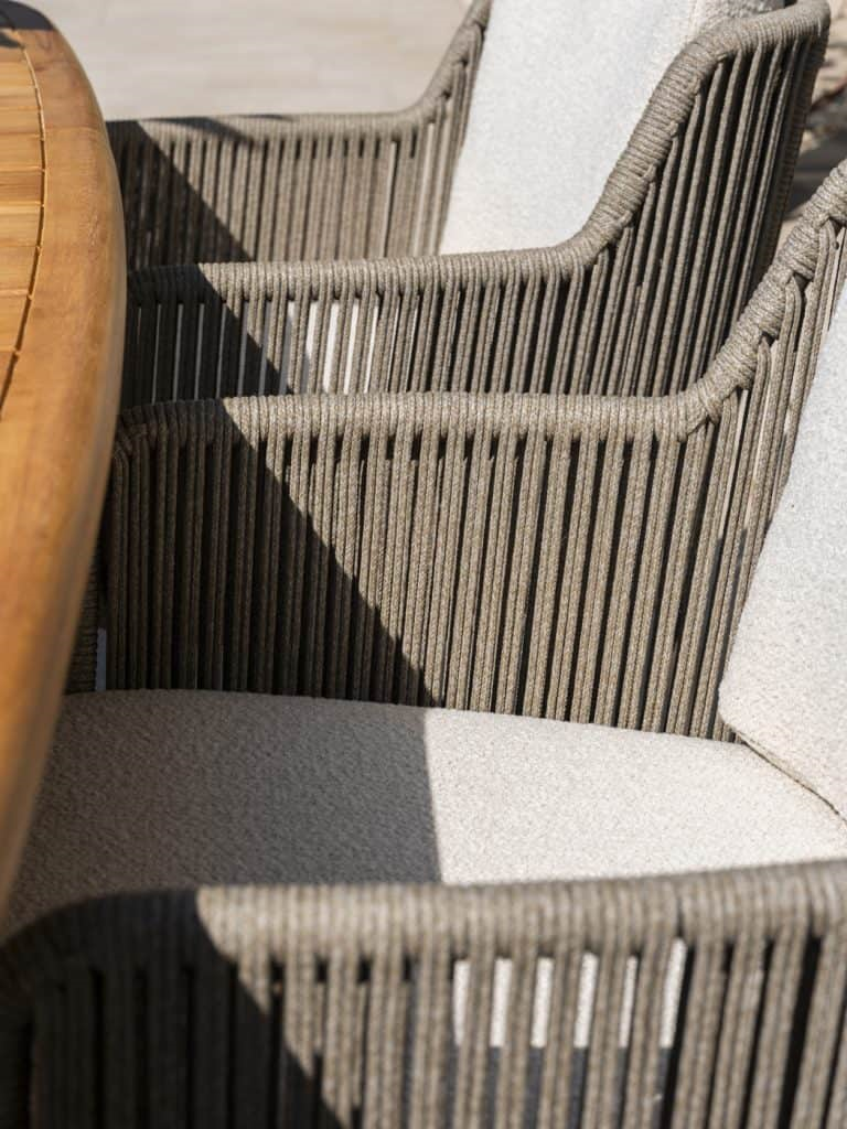 De Bernini Terre is vervaardigd uit hoogwaardig RVS en duurzaam rope, wat niet alleen zorgt voor een moderne uitstraling, maar ook voor weerbestendigheid en duurzaamheid. De warme Terre kleur van de stoel wordt prachtig geaccentueerd door de Latte kleurige kussens, die extra comfort bieden tijdens lange zomerse diners of gezellige avonden buiten.