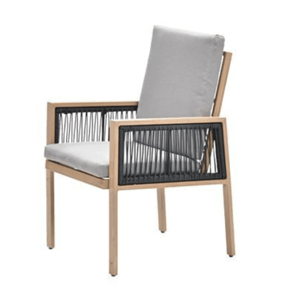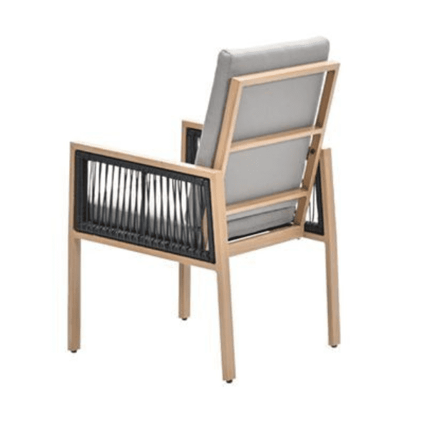 Gemaakt van hoogwaardig aluminium, garandeert deze stoel duurzaamheid en weerbestendigheid, ideaal voor langdurig gebruik in de tuin. De kussens, die een subtiele en stijlvolle aanvulling vormen op de houtlook afwerking, zorgen voor extra comfort tijdens lange zomerse diners.