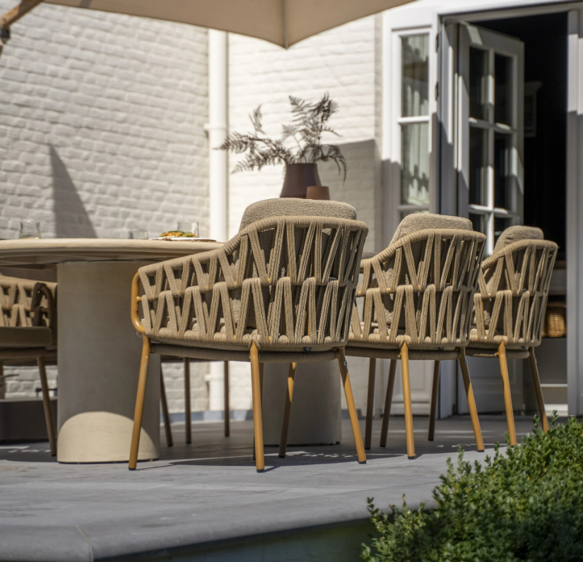 Dining tafel Colorado travertin Ø160 cm + Dining stoel Biarritz amber 8-dlg
