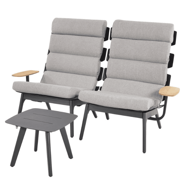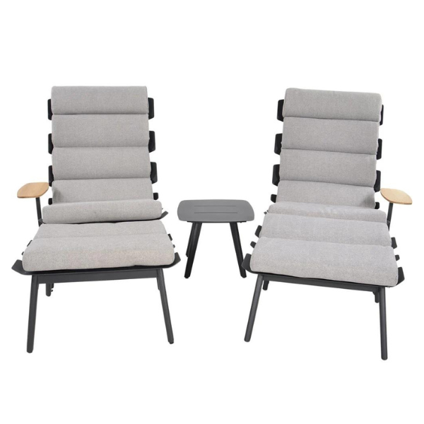 Gemaakt van hoogwaardig aluminium, polyester en teakhout, straalt deze set duurzaamheid en kwaliteit uit. Het gebruik van teakhout voegt een natuurlijke charme toe, terwijl het aluminium frame zorgt voor een moderne uitstraling en weerbestendigheid. De lichtgrijze kussens zijn niet alleen stijlvol, maar ook ontworpen voor optimaal zitcomfort.