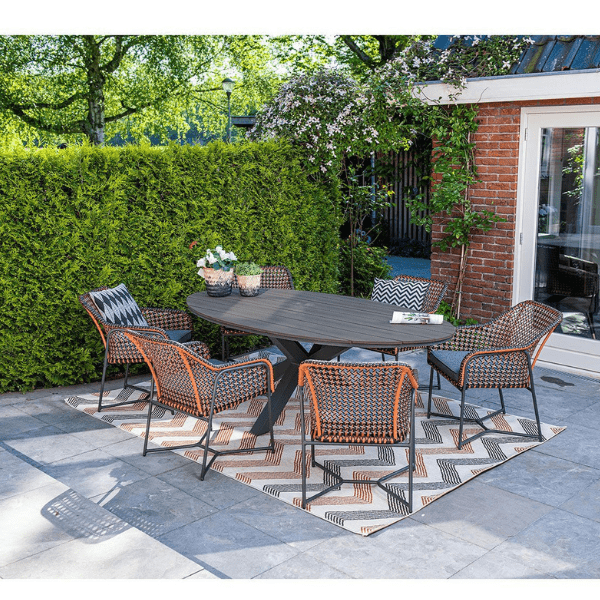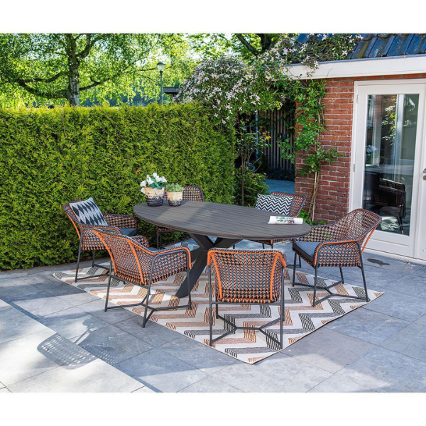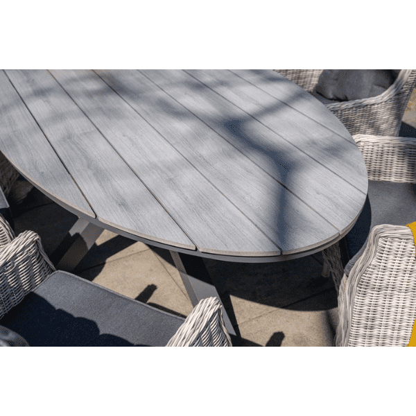 Gemaakt van hoogwaardig aluminium en duurzaam Imo-wood, straalt deze tafel niet alleen luxe uit, maar is hij ook bestand tegen de elementen, waardoor hij perfect is voor zowel binnen- als buitengebruik. De antracietkleurige afwerking voegt een moderne touch toe aan elke omgeving, terwijl het ovale ontwerp een uitnodigende sfeer creëert.