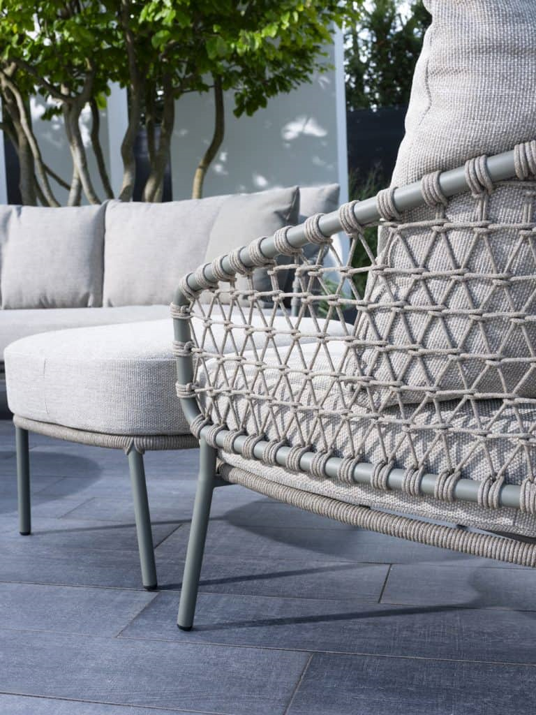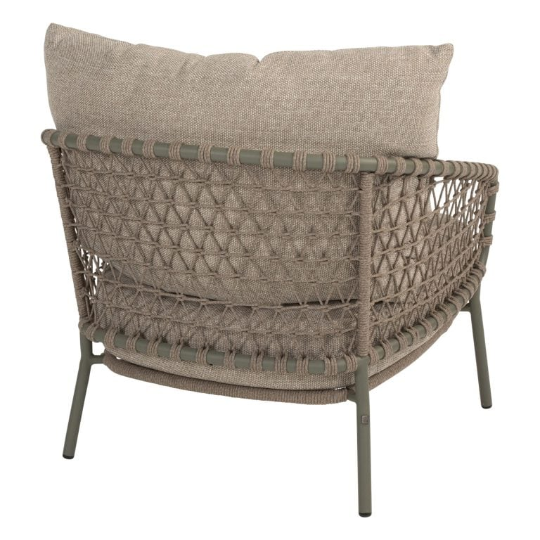 De Jura lounge stoel is vervaardigd uit hoogwaardig RVS en duurzaam rope, wat niet alleen zorgt voor een robuuste constructie maar ook voor een elegante uitstraling. De stoel wordt geleverd met twee comfortabele kussens in een stijlvolle taupe kleur, die een prachtig contrast vormen met de olijfkleurige bekleding van de stoel. Deze kussens zijn ontworpen om ultiem zitcomfort te bieden, zodat u urenlang kunt loungen zonder concessies te doen aan stijl of gemak.