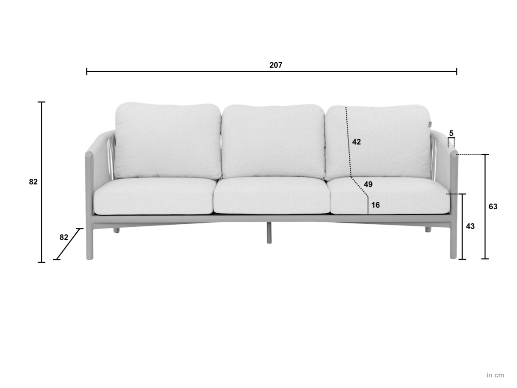 | Afmeting bank | Lengte 46 cm Breedte 204 cm Hoogte 82 cm |