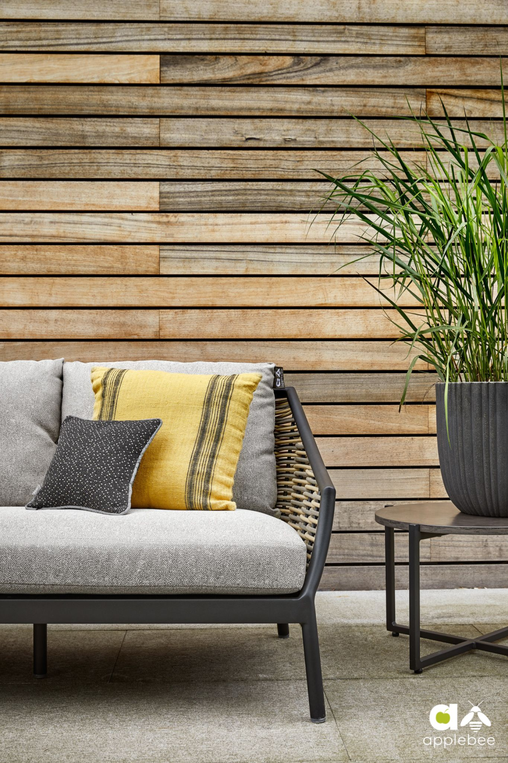 De kussens van de Loungebank Milou zijn vervaardigd door Apple Bee, een merk dat bekend staat om zijn hoogwaardige buitenmeubelkussens. De kussens zijn uitgevoerd in een stijlvolle grijze tint die perfect contrasteert met het zwarte frame, en zijn ontworpen om comfort en ondersteuning te bieden. Ze zijn bovendien weerbestendig, zodat ze bestand zijn tegen verschillende weersomstandigheden zonder aan kwaliteit in te boeten. Hierdoor blijft de bank er seizoen na seizoen als nieuw uitzien.
