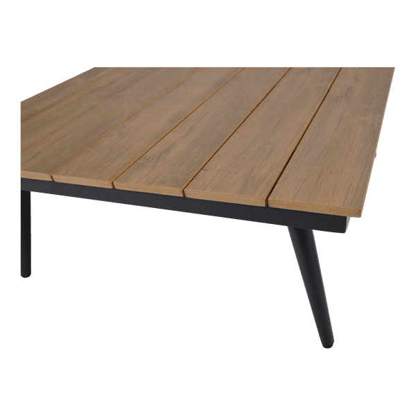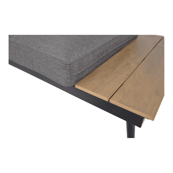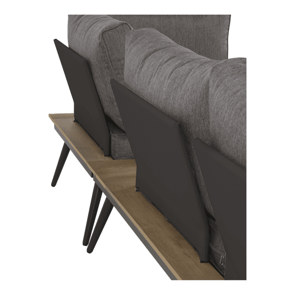 De set is vervaardigd uit hoogwaardig aluminium in een elegante antracietkleur, wat zorgt voor een moderne uitstraling en duurzaamheid. De hoekbank heeft een lengte van 164 cm, een breedte van 76 cm en een hoogte van 67,5 cm, waardoor hij ruim voldoende zitruimte biedt zonder te veel ruimte in te nemen.