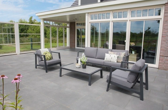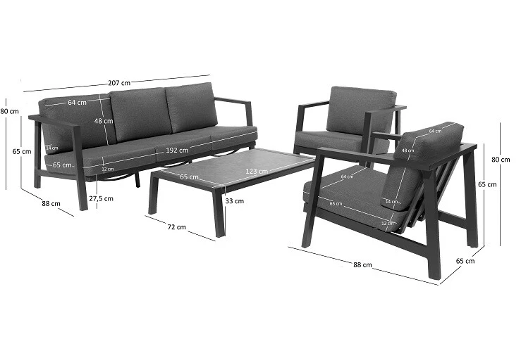 De set bestaat uit een ruime bank, een comfortabele hoekbank, en een stijlvolle stoel, aangevuld met een praktische tafel. Elk stuk is zorgvuldig vervaardigd uit duurzaam materiaal, wat zorgt voor een lange levensduur en weerbestendigheid. De set biedt voldoende zitplaatsen voor al uw gasten, zodat u kunt genieten van gezellige avonden en ontspannen middagen in goed gezelschap.