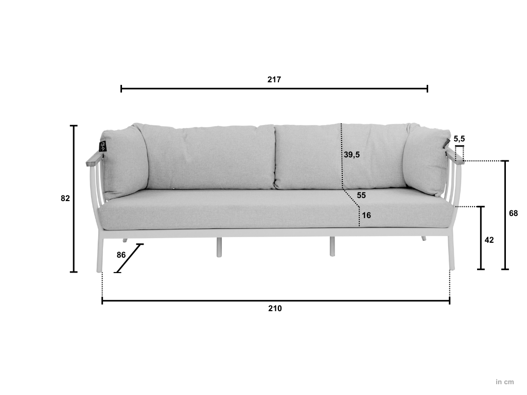 De set bestaat uit een ruime 3-zits bank en twee comfortabele stoelen, waardoor er voldoende zitplaats is voor maximaal vijf personen. De bank heeft een royale afmeting van 217 cm in lengte, 68 cm in breedte en 66 cm in hoogte, terwijl de stoelen elk een afmeting hebben van 86 cm in lengte, 81 cm in breedte en 64 cm in hoogte. Deze afmetingen maken de set ideaal voor zowel grote als kleinere buitenruimtes. De kussens zijn uitgevoerd in een stijlvolle grijze kleur, die prachtig contrasteert met het zwarte aluminium frame van de set.