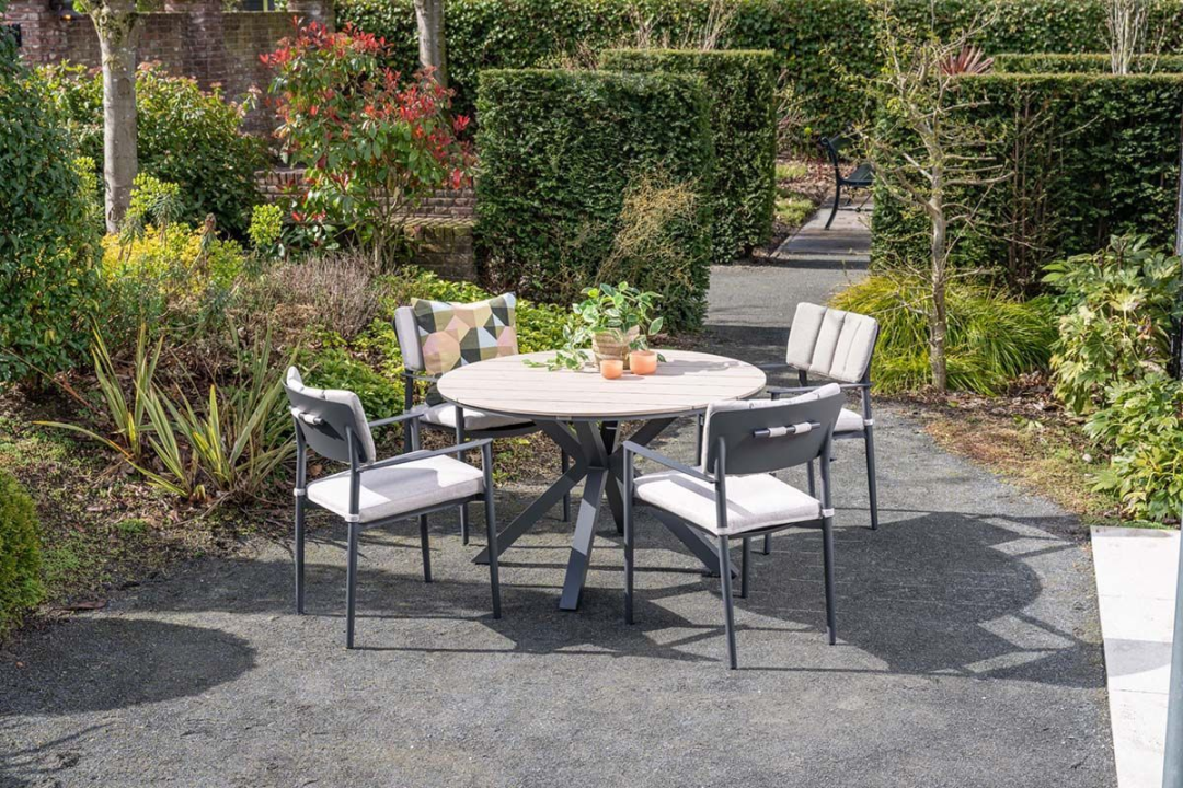 Ontdek de perfecte balans tussen stijl en functionaliteit met de Dining tafel Edison Light Teak van Garden Impressions. Met een royale diameter van 122 cm en een hoogte van 74 cm biedt deze tafel voldoende ruimte voor gezellige diners en levendige gesprekken in de buitenlucht. De elegante antracietkleurige afwerking straalt moderne verfijning uit, terwijl het duurzame aluminium materiaal zorgt voor een robuuste en weerbestendige constructie. Deze tafel is een ideale aanvulling voor elke buitenruimte, waar hij moeiteloos een vleugje luxe en comfort toevoegt. Creëer onvergetelijke momenten met vrienden en familie rondom deze prachtige tafel, die ontworpen is om jarenlang mee te gaan.